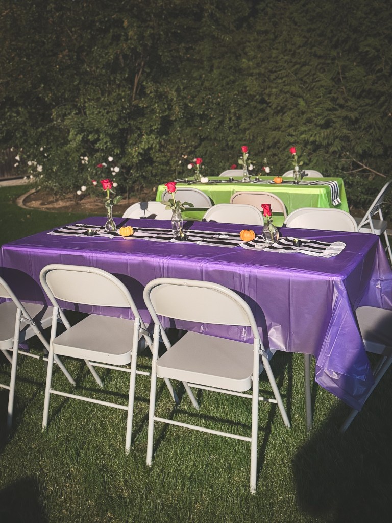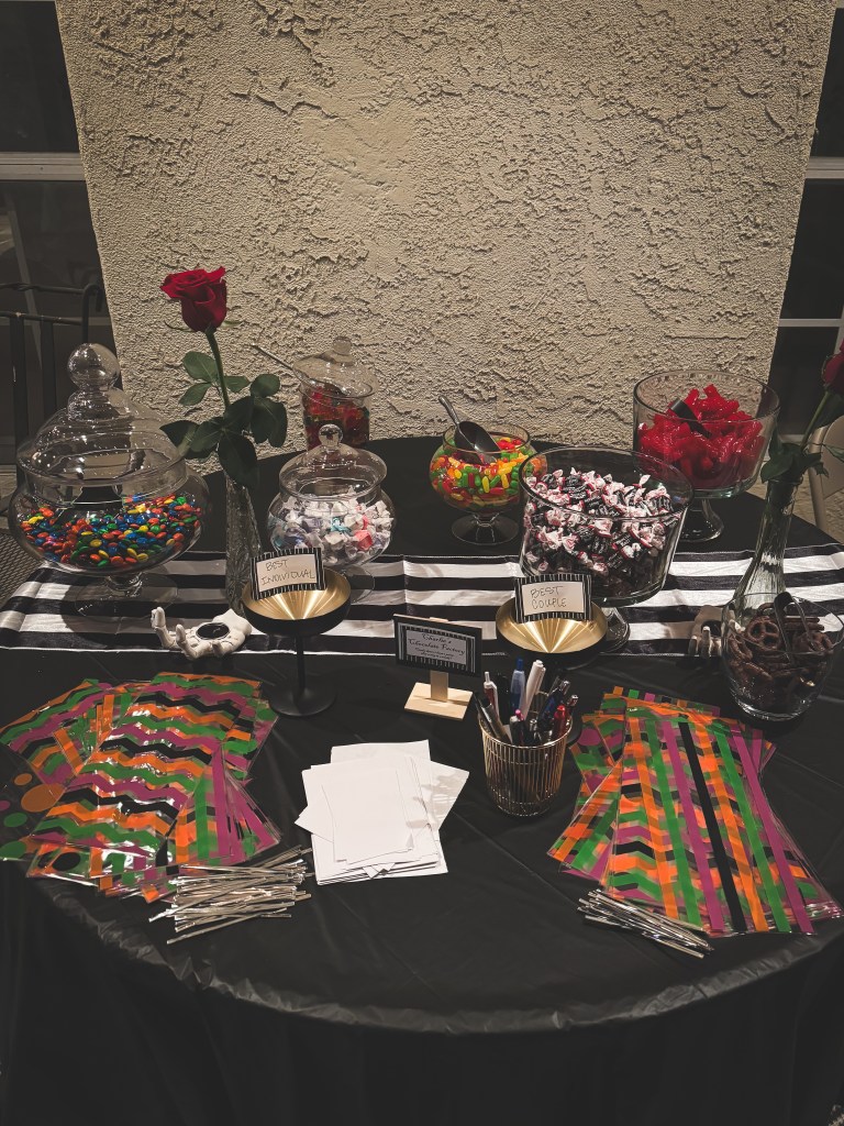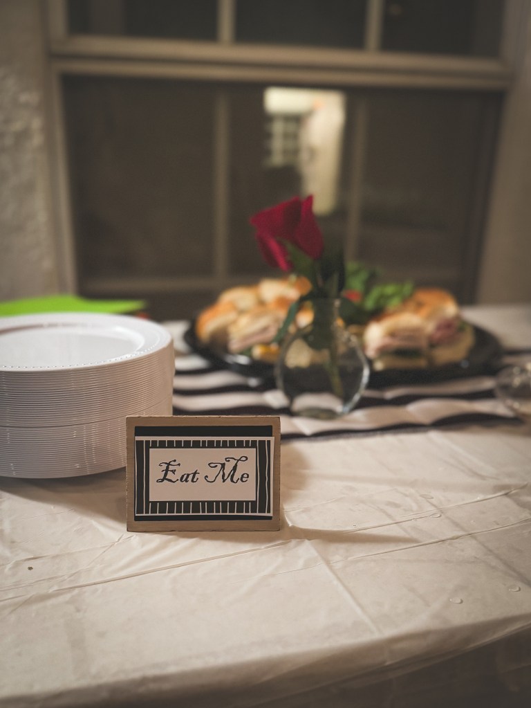 We did simple disposable table cloths (Dollar Store and Hobby Lobby never fail me!) with black and white striped runners. My friend mixed in vases with red roses (Alice in Wonderland), small pairs of scissors (Edward Scissorhands), and playing cards (Alice in Wonderland). She had some other amazing ideas for tying in different movies, but we simply ran out of time!