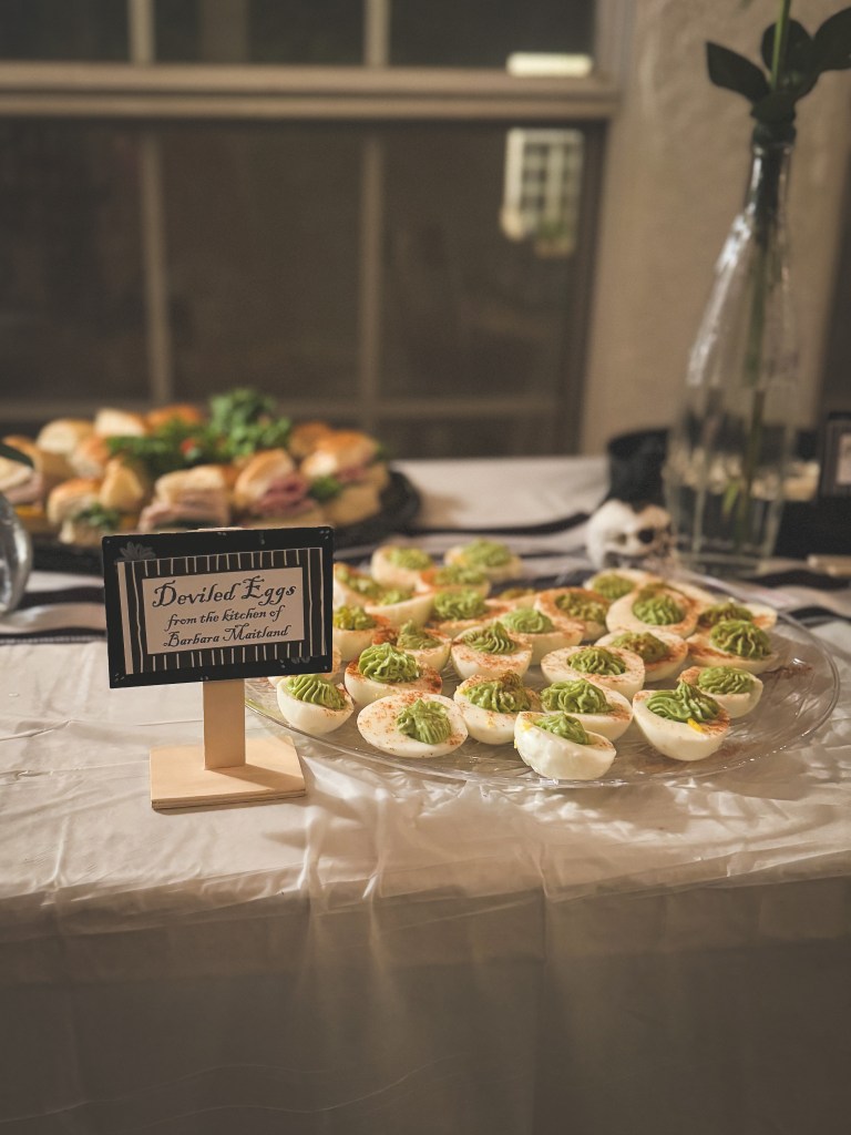 - Deviled Eggs: use your favorite deviled egg recipe. You can get a lil’ spooky with it by using food coloring to dye the filling black, purple, or green (I did green!). You can also top with thinly sliced black olives to give it a spooky eyeball effect. We said these were from the kitchen of Barbara Maitland (Beetlejuice) to further tie it into the theme!
