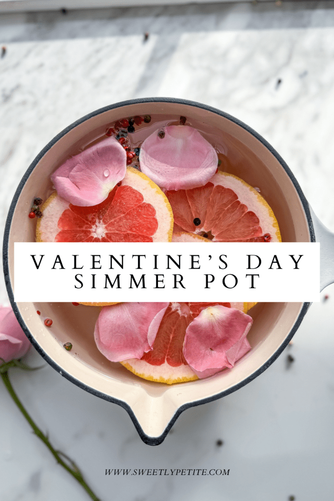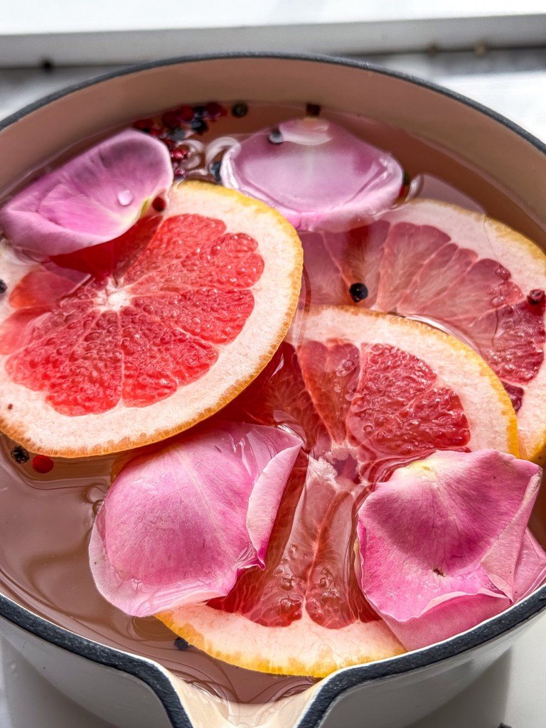 Embrace the hygge lifestyle and cozy up your home with a simmer pot! This one takes fresh (or leftover) rose petals from love day (or any day!) to brighten your home. Fragrant rose, peppercorn, and grapefruit are simmered together to brew a bright and fresh smell that creates a cozy, romantic moment to share with loved ones (or yourself!).