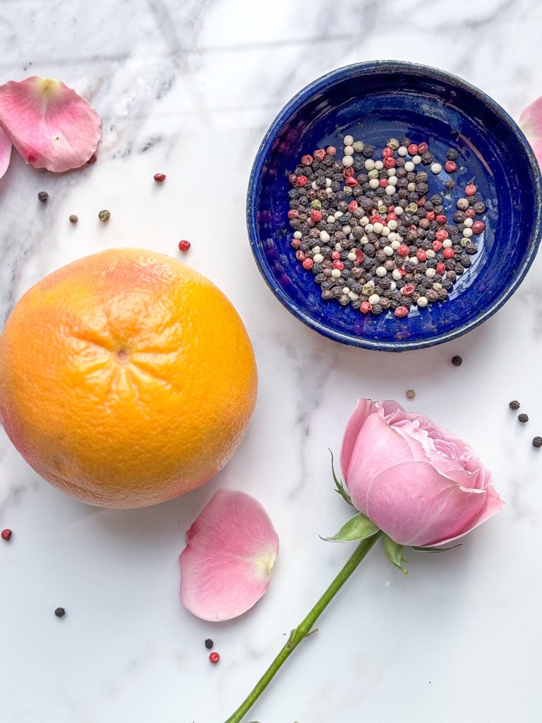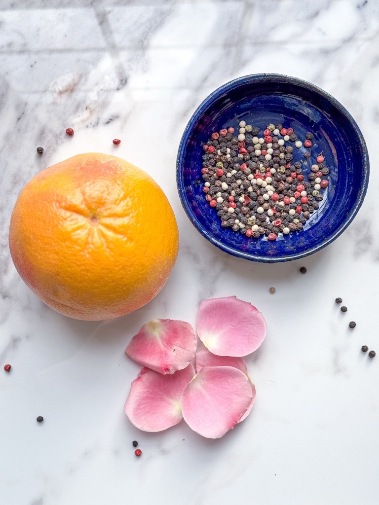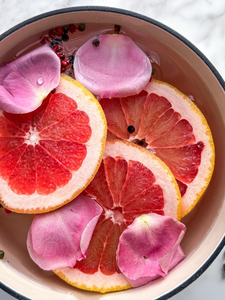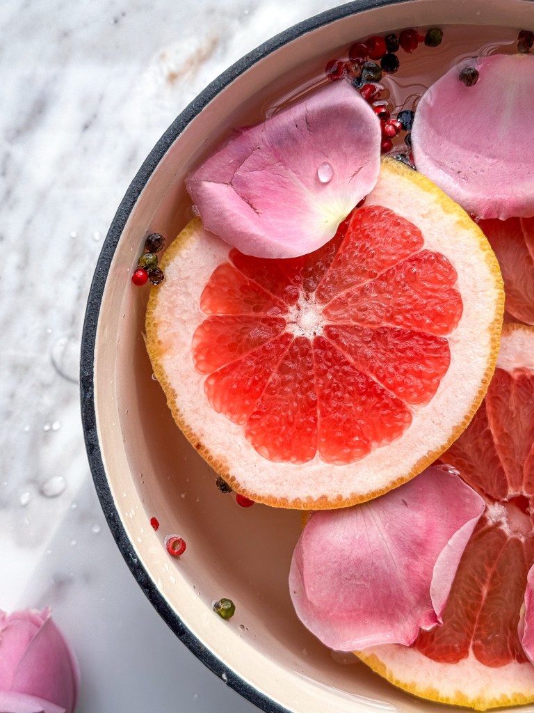 Alternatively, you can fill a crockpot 3/4 full of water. Add the grapefruit, rose petals, and peppercorn. Set on high for 3-4 hours uncovered, so potpourri can become heated and the aromas develop.