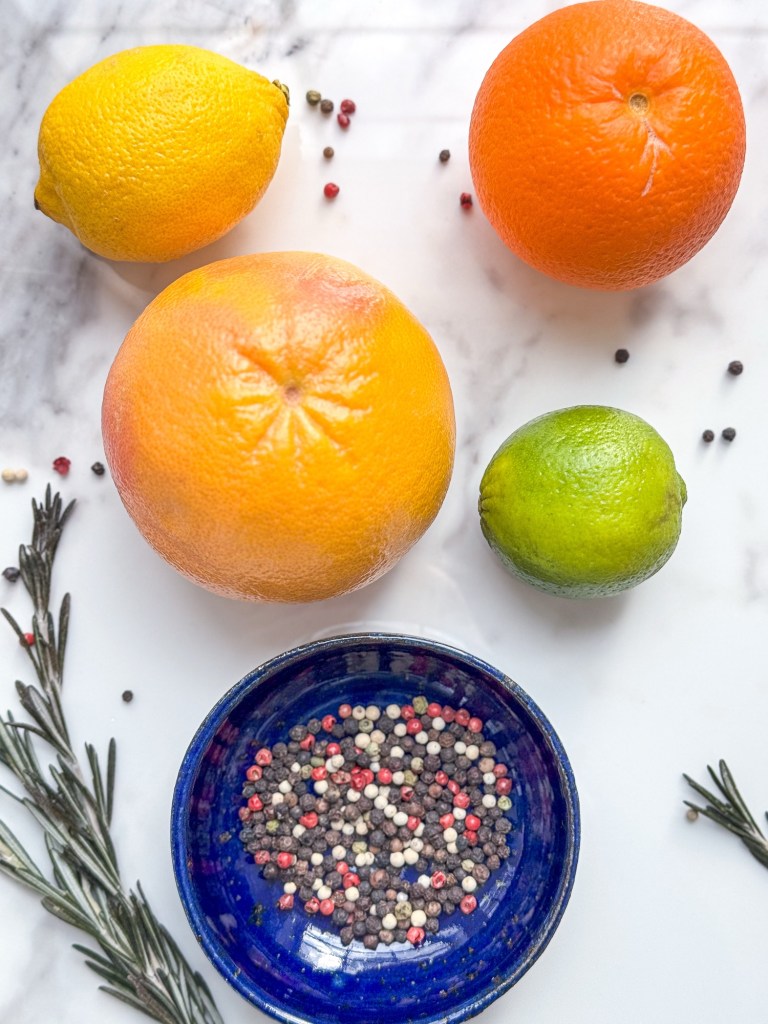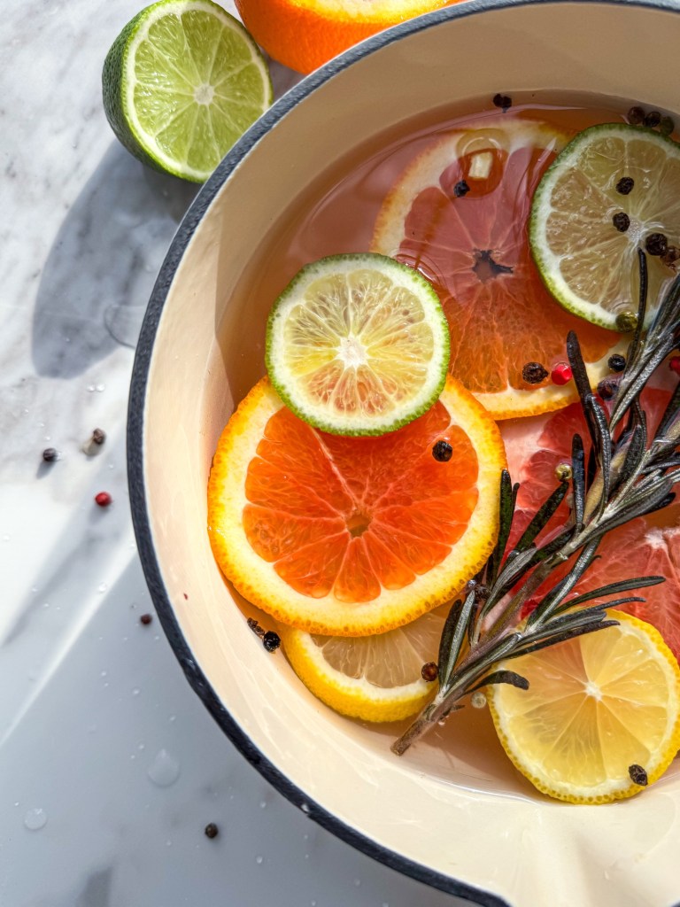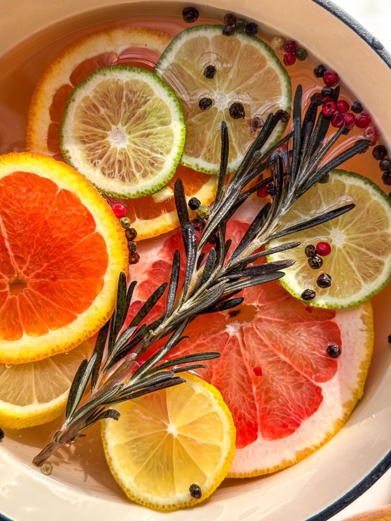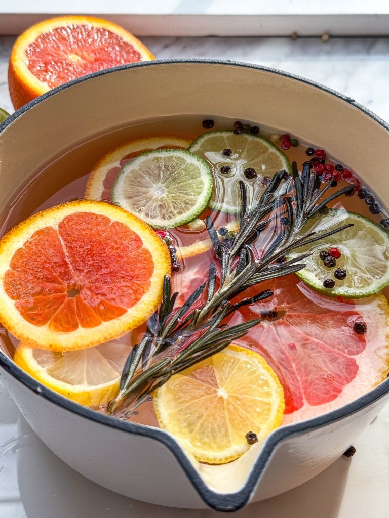 Alternatively, you can fill a crockpot 3/4 full of water. Add the sliced citrus, peppercorn, and rosemary. Set on high for 3-4 hours uncovered, so potpourri can become heated and the aromas develop.
