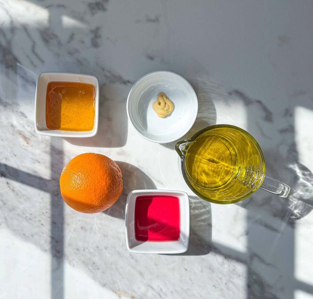 2. Combine the Liquids: In a jar or small bowl, whisk together the orange juice, orange zest, red wine vinegar, honey, and mustard.