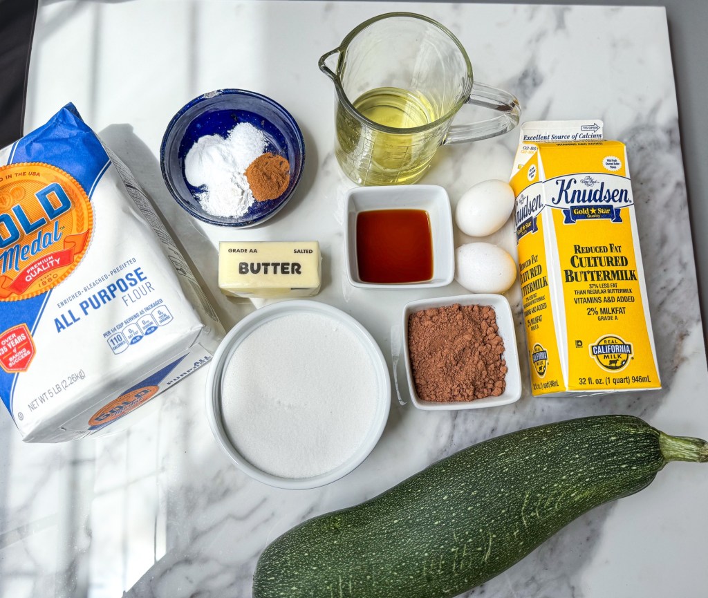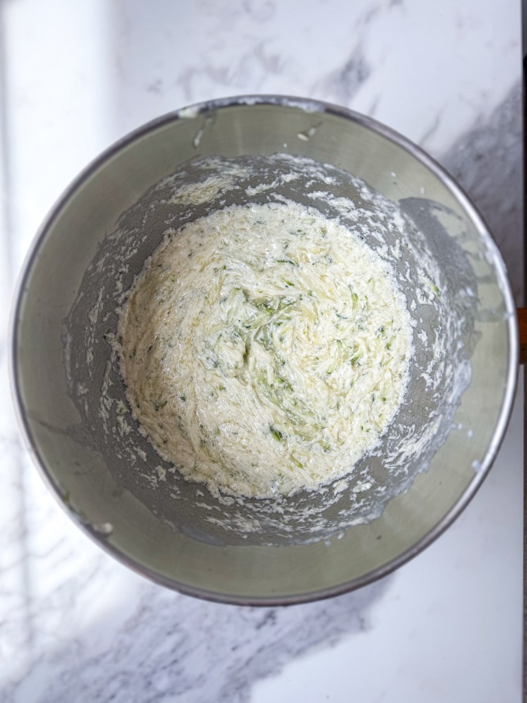 - Mix: Place the butter, oil, white sugar, and eggs into the bowl of a stand mixer. Cream until light and fluffy! Next, add in your shredded zucchini, vanilla, and buttermilk. Mix on a low speed until combined.