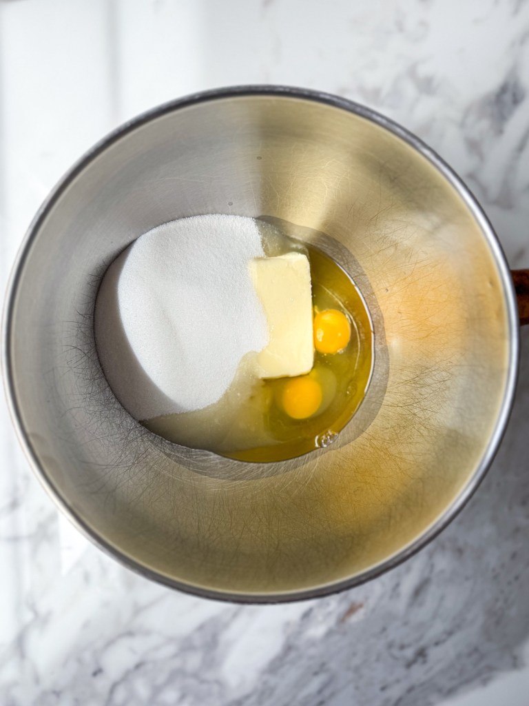 - In a large mixing bowl or in the bowl of a stand mixer, cream together the butter, oil, white sugar, and eggs until light and fluffy.