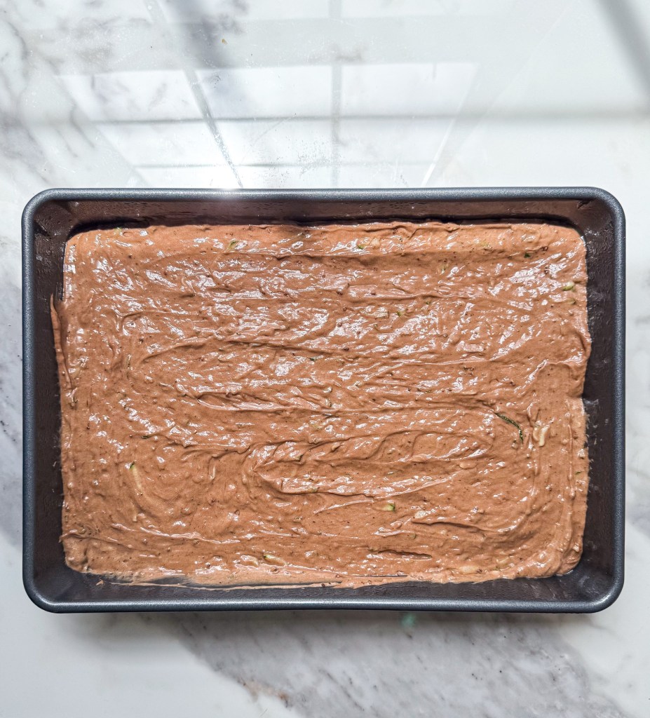 - Combine: gradually add the dry ingredients to the zucchini mixture; mix on a low speed until combined. Pour the cake batter into the prepared pan.