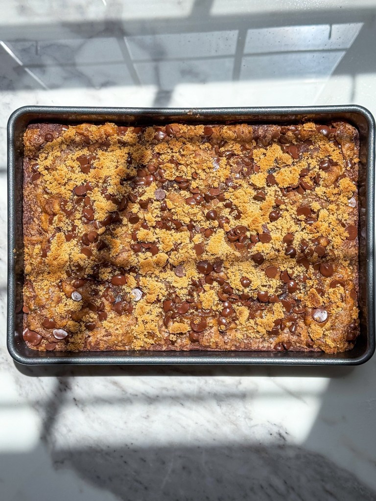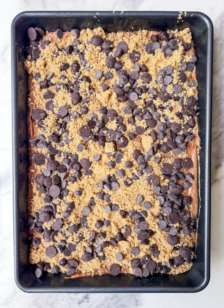 - Topping: Evenly sprinkle the chocolate chips onto the top of the cake, then repeat with the brown sugar.