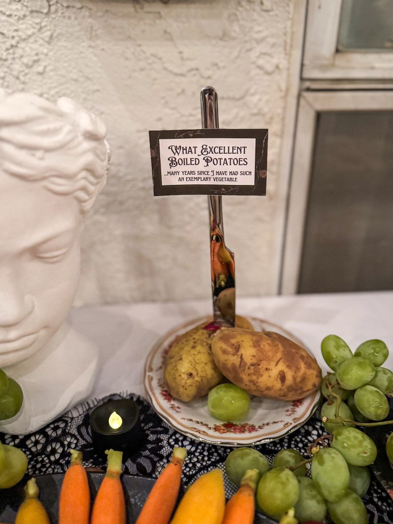- Potatoes. Any form. But really, boiled potatoes would be best. I ran out of time and didn’t get any potatoes for the spread, so raw potatoes with a sign and fake wax blood would have to do!