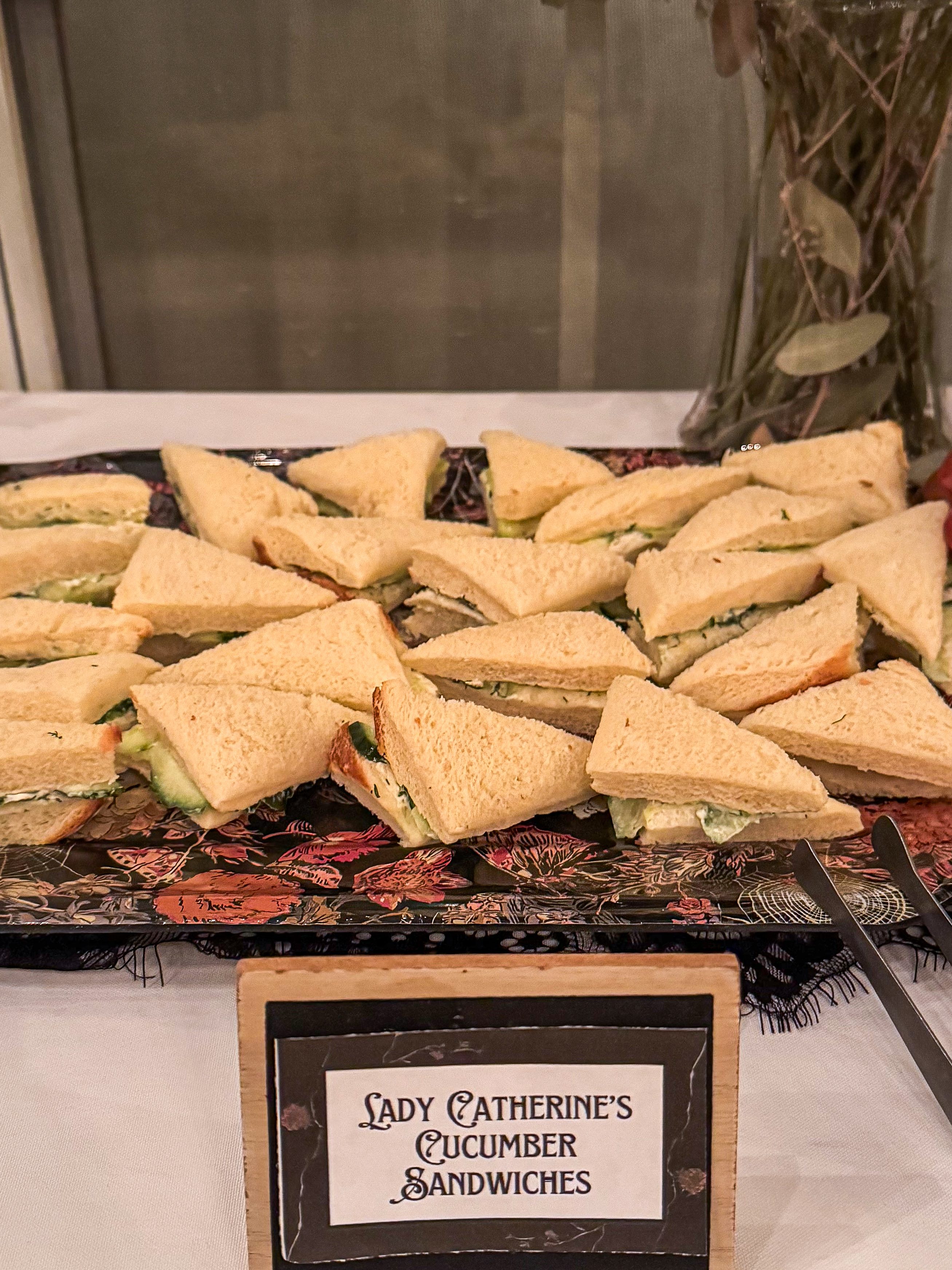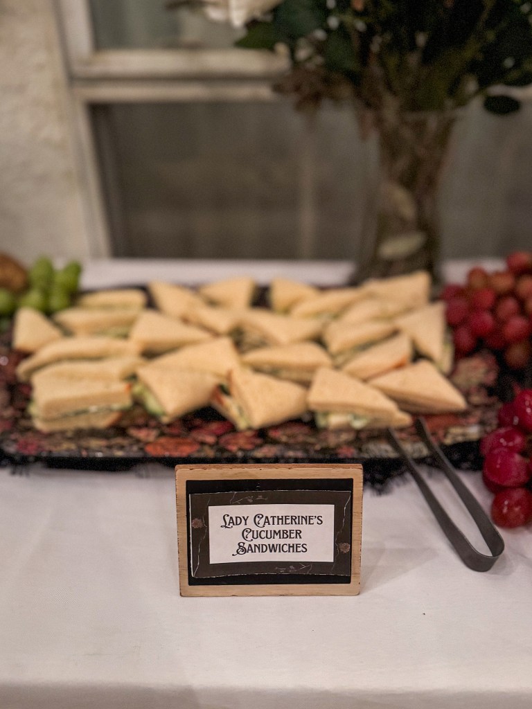 - Cucumber Sandwiches: Lady Catherine brought her finest. Spread a bit of butter on two piece of good quality white bread. In a bowl, beat a brick of softened cream cheese with some fresh dill and the juice and zest of one lemon. Spread evenly on top of the buttered bread, then place thinly sliced cucumber on one piece of the bread. Make your sandwich, then cut the edges and slice diagnolly. Voila!