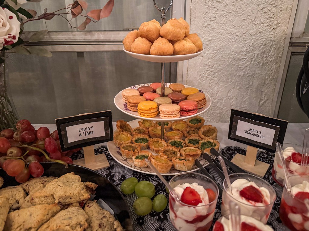 - Fruit: I used grapes mostly as a garnish, but people gobbled them up. Growing up my friends and I would have “tea” parties; one of my friends would bring raspberries stuffed with chocolate chips. They were delightfully tasty and simple. Those would be cute here, too!