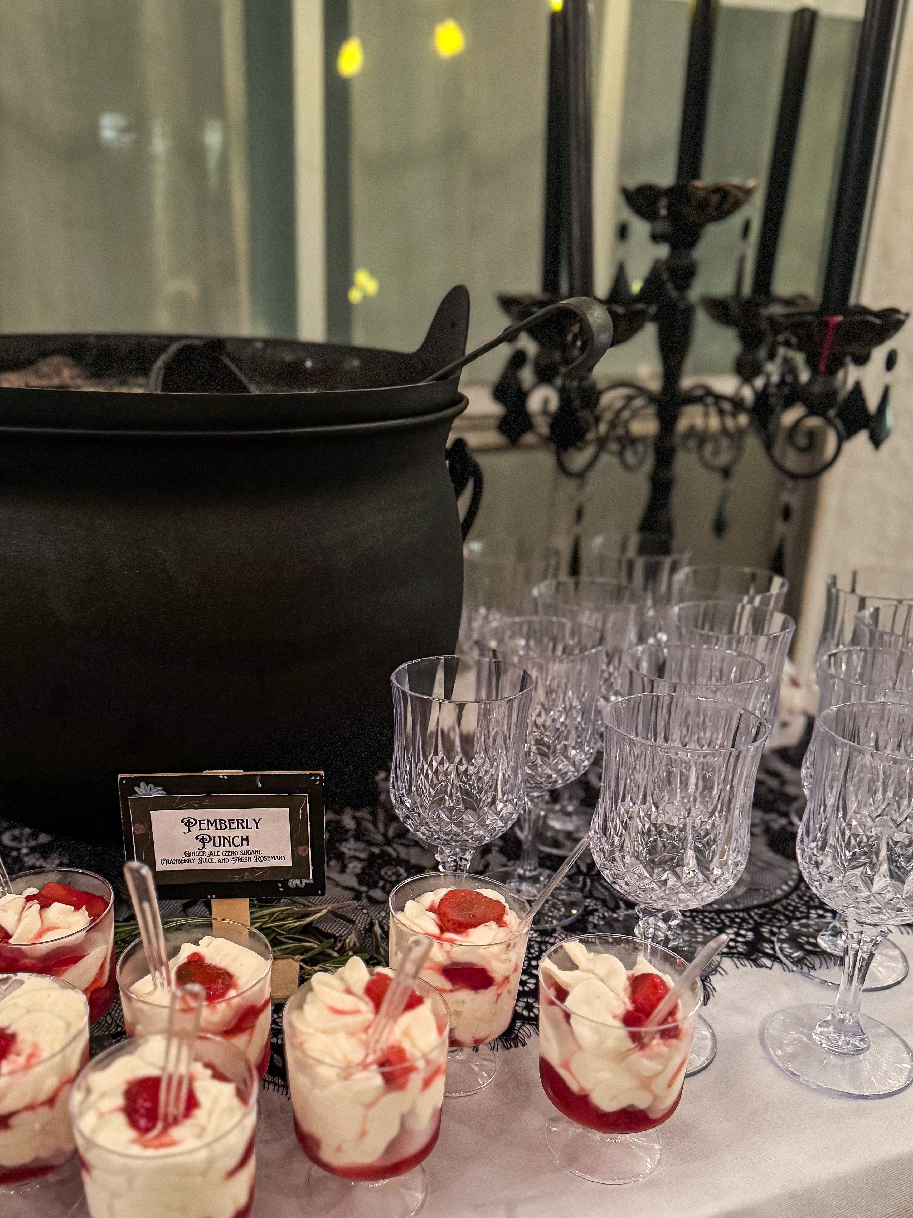 - Pemberly Punch: one part ginger ale, one part cranberry juice, a couple springs of rosemary, and ice. I typically use zero sugar ginger ale and pink cranberry juice. BONUS serve your punch with dry ice so it’s oh-so spooky (just be careful while handling dry ice!).