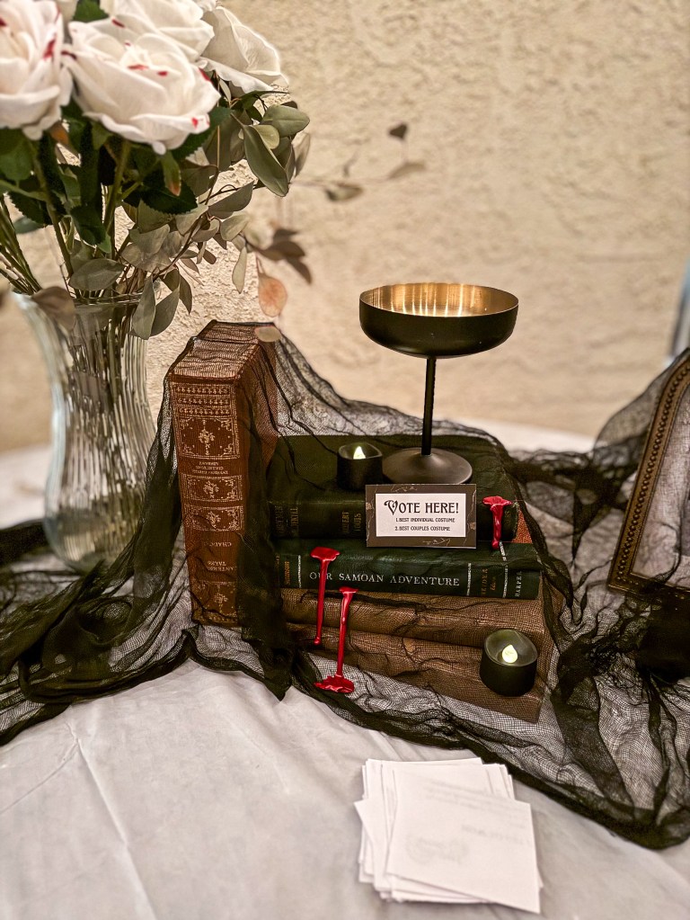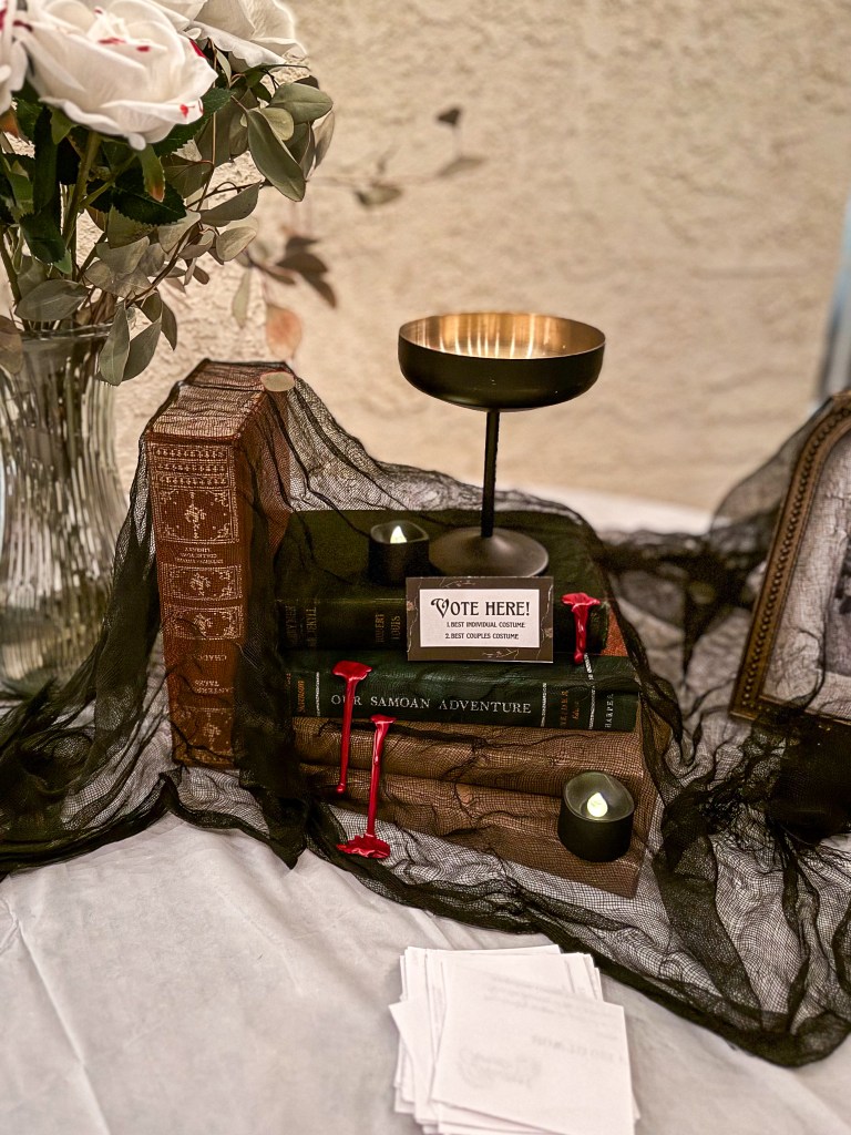 - Fake blood drips & splatters: I used wax to create the blood effects. I melted the wax and carefully dripped it down the sides of parment paper covered books. Once cooled, it can be removed and placed on candle sticks, books, etc. I also dripped the hot wax on some of the white roses to make them look blood-splattered. I loved these little details! I’m not super into gorey-Halloween, so I liked these little subtle decorations! Just the right amount of elegant spooky for me 😉