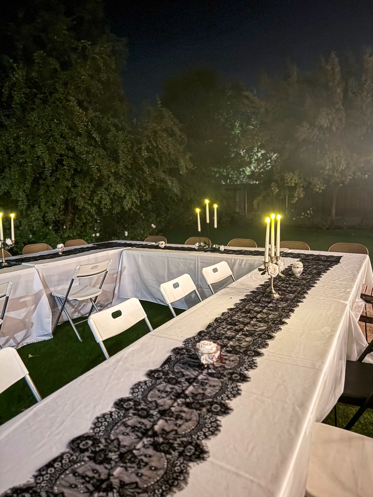 I did white table cloths, courtesy of my wonderful MIL (Dollar Store disposable ones would be fine, too!) with black Victorian lace runners. Here are some of our favorite decoration finds (here’s my Amazon list, too!)